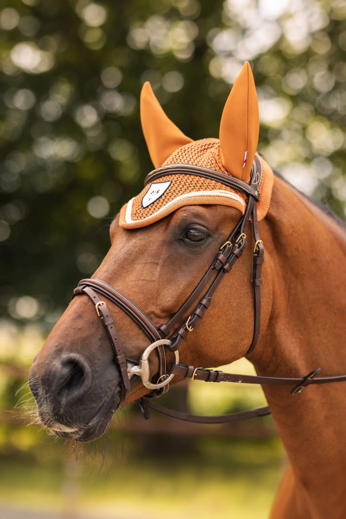 Klasyczna dziergana część główna i elastyczna, skutecznie tłumiąca hałas część nauszna z materiału Coolmax, która zapewnia koniowi przyjemny chłód nawet w cieplejsze dni. Na środku naszywka z logo B Vertigo.