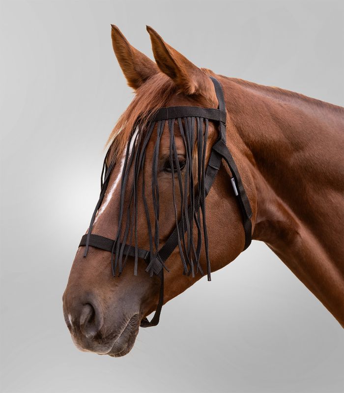 Kantar pastwiskowy z frędzlami zapewnia bezpieczeństwo i komfort podczas wypasu. Zintegrowane frędzle skutecznie chronią oczy konia przed uciążliwymi muchami. Dzięki zapięciu na rzep w części nagłowia kantar rozepnie się pod naciskiem, co pozwala koniowi uwolnić się w sytuacji zagrożenia. Model jest wyjątkowo lekki i pozbawiony metalowych elementów. Pasek na szyję również wyposażony jest w zabezpieczenie na rzep.