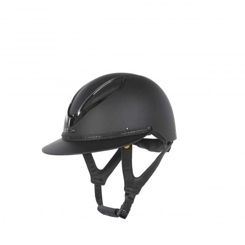 Ten elegancki kask to doskonałe połączenie nowoczesnego designu z zaawansowaną technologią ochrony. Zaprojektowany z myślą o wymagających jeźdźcach. Łączy stylowy wygląd z bezpieczeństwem i wygodą noszenia. W kasku zastosowano system MIPS (Multidirectional Impact Protection System) – innowacyjne rozwiązanie. Stworzone z myślą o zwiększeniu bezpieczeństwa jeźdźców w sytuacjach, w których dochodzi do ukośnych lub rotacyjnych uderzeń, a nie tylko tych bezpośrednich. System ten opiera się na dodatkowej, ruchomej warstwie znajdującej się między wyściółką a skorupą ochronną kasku. Warstwa ta może przesunąć się w zakresie 10-15 mm we wszystkich kierunkach, symulując naturalny mechanizm ochronny mózgu. Dzięki temu, podczas upadku, część siły obrotowej zostaje przejęta i rozproszona przez kask- zamiast przenosić się bezpośrednio na czaszkę i mózg. W praktyce oznacza to realne zmniejszenie ryzyka uszkodzeń neurologicznych, zwłaszcza tych spowodowanych nagłym skręceniem głowy w momencie uderzenia. Lekka skorupa z pianki EPS i przednia wentylacja gwarantują doskonałą cyrkulację powietrza. Skutecznie odprowadza ciepło nawet podczas intensywnego treningu. Wyjmowana wyściółka wewnętrzna jest przystosowana do prania w pralce, co zapewnia łatwość utrzymania higieny. Zewnętrzna skorupa wykonana z matowego tworzywa ABS z połyskującymi akcentami. Skorupa jest nie tylko odporna na uszkodzenia, ale też przyciąga wzrok swoim nowoczesnym wykończeniem. Szeroki daszek z odpinanym frontem ozdobionym kryształkami dodaje subtelnego blasku i elegancji. Perfekcyjne dopasowanie gwarantuje regulowany pierścień, który łatwo dostosowuje się do kształtu głowy. Pasek z nowoczesnym zapięciem typu Y zapewnia stabilność i wygodę. Całość zamknięta jest w wytrzymałej konstrukcji typu Hardshell. Połączenie odpornej zewnętrznej skorupy ABS z wewnętrzną warstwą EPS gwarantuje znakomitą absorpcję wstrząsów i trwałość na lata. Jeśli szukasz stylowego kasku jeździeckiego, który nie tylko świetnie wygląda, ale też oferuje realną ochronę i komfort w każdych warunkach – ten model spełni Twoje oczekiwania.