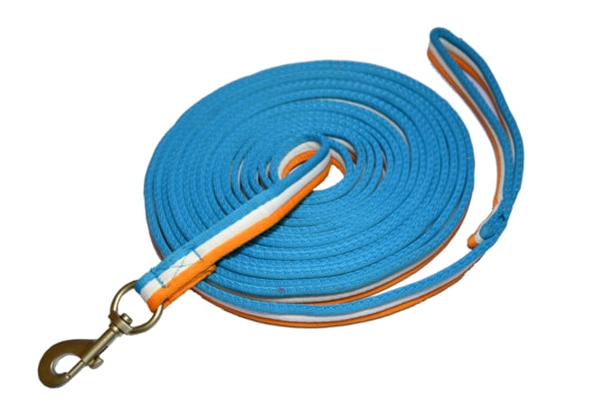 Lonża wykonana z miękkiego, nieparzącego materiału nylonowego. Wyposażona w obrotowy karabińczyk. Dobrze układa się w dłoni, wyposażona jest w wygodną rączkę. Pakowana w poręczną torbę.
