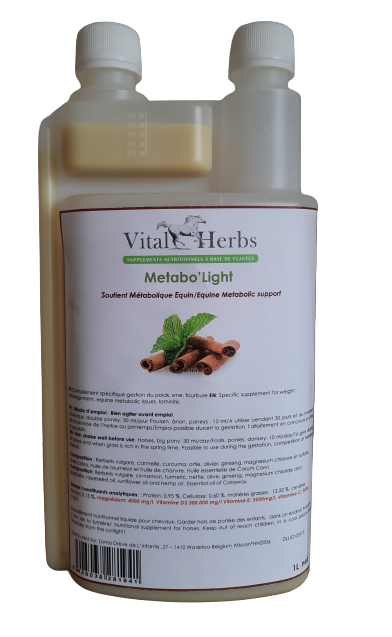 Metabo'Light to w 100% naturalny suplement diety dla koni lub kuców z nadwagą, które pomimo ścisłej diety nie mogą schudnąć. Polecany jest również do wspomagania koniowatych, osłów insulinoopornych, przewlekle zmęczonych i/lub cierpiących na koński zespół metaboliczny.