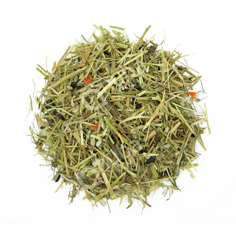 Skład: lucerna sieczka, lucerna granulat, sieczka z traw, słoma owsiana, drożdże paszowe, siemie lniane, łuska słonecznika, olej kokosowy, słonecznik ziarno, algi morskie, aminokwasowy chelat cynku, msm, tlenek magnezu, metionina, aminokwasowy chelat miedzi, aromat, witaminy, biotyna, selen, probiotyk.