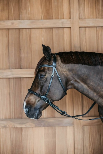 Konstrukcja bezuzdna zapewnia kontrolę poprzez równomierny nacisk na nos i szczękę, co zmniejsza dyskomfort konia i zwiększa komfort pracy. Ergonomiczny nagłówek z miękkiej skóry minimalizuje nacisk w okolicy potylicy i uszu, a wysokiej jakości materiały gwarantują trwałość i elegancki wygląd ogłowia.