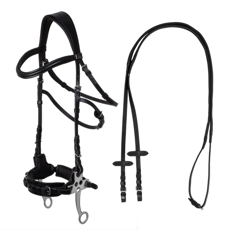 Kompletne ogłowie do montażu bezwędzidłowego ( bez gryzienia ) wykonane z bardzo miękkiej i wysokiej jakości gładkiej skóry, z nakładką i gniazdem wyściełanym dla większego komfortu. Idealny dla koni z problemami w pysku, zbyt wrażliwych lub przyzwyczajonych do jazdy bez wędzidła.