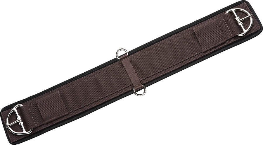 Popręg wyposażony w dwa pierścienie do dopinania pomoc szkoleniowych. Niklowane, stalowe klamry.